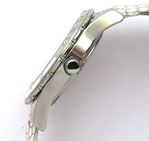 Bonett damearmbåndsur, ref. nr. 1214 i urkasse af stål. Hvid skive med arabertal, central og separat sekundviser samt day/date visning. Quartzværk. Urkasse diameter 40 mm. Hvid slangepræget læderrem med metalspænde.