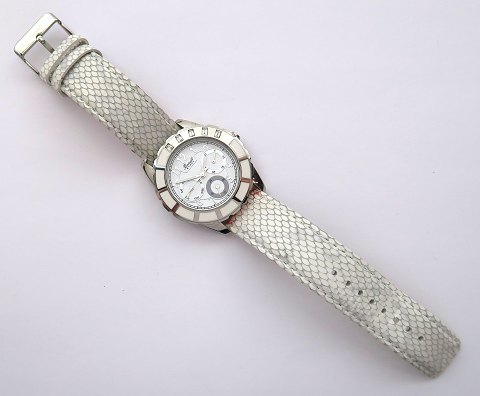 Bonett damearmbåndsur, ref. nr. 1214 i urkasse af stål. Hvid skive med arabertal, central og separat sekundviser samt day/date visning. Quartzværk. Urkasse diameter 40 mm. Hvid slangepræget læderrem med metalspænde.