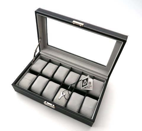 Davidt, aflåselig opbevaringsboks og showcase for 12 armbåndsure. Læderimitat med glas i låget. Indvendig 12 fag med puder. Nøgle medfølger. 32 x 19 x 9 cm.