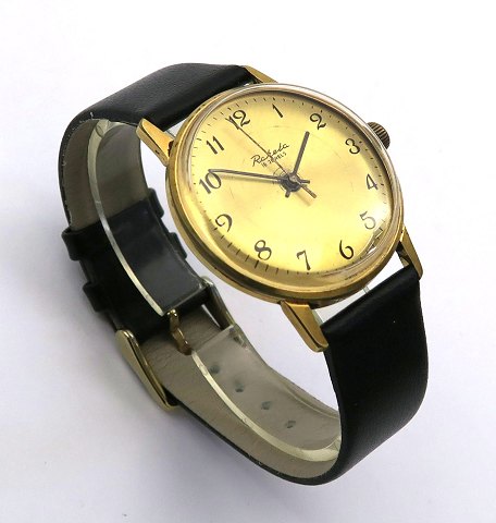 Raketa, klassisk russisk herrearmbåndsur i urkasse af guldtonet stål. Messingfarvet skive med arabertal og central sekundviser. Manuelt mekanisk optræksværk. Urkasse diameter 34 mm. Læderrem med metalspænde.