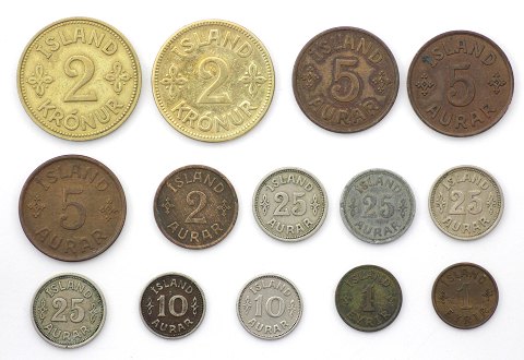 1 Eyrir 1931 og 1942, 2 Aurar 1926, 5 Aurar 1926 og 2x 1942, 10 Aurar 1923 og 1940, 25 Aurar 2x 1922, 1940 og 1942 samt 2 Kronur 1929 og 1940.