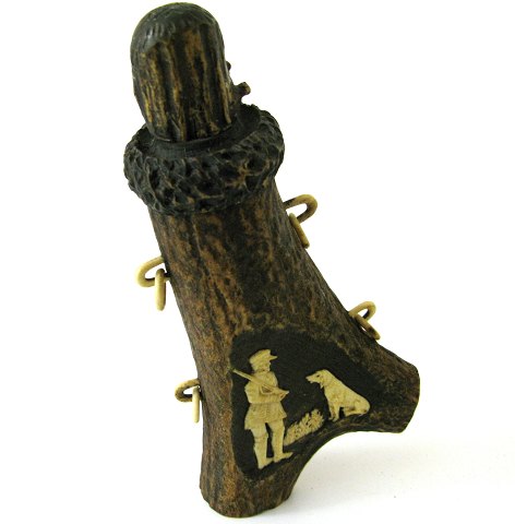 Krudthorn med skæring i form af jagtscene, låg med gevind og ophængøskner skåret af ben. L. 17 cm. Ifølge motivet tilskrevet 19. årh. slutning.