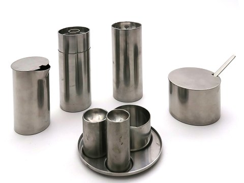 Stelton, salt og peberkværn, H. 13 cm, sukker og flødesæt med ske, H. 7 cm. samt sæt med salt og peber strøbøsse og tandstiksholder på en bakke. Alle genstande er af rustfrit stål.