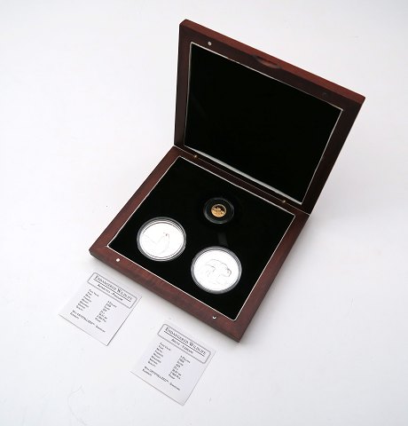 Cook Islands, 5 Dollar, 2008, sølv, Swarovski krystal isat, KM# 616, 5 Dollar, 2008, sølv, Swarovski krystal isat, KM# 617 og 10 Dollar, 2008, Guld, KM# 1206. I præsentationsæske med certifikat til de to sølvmønter, som har oplag på kun 2500 stk.