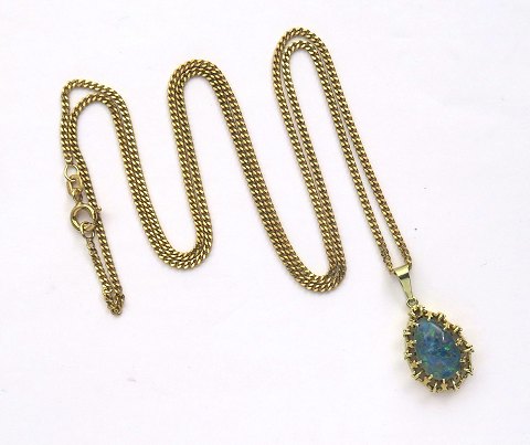 Halskæde af forgyldt sterling sølv, L. 60 cm., prydet med vedhæng af 14 kt. guld med ligeledes dråbeformet opal med fin fluorecens, L. 25 mm. Samlet vægt ca. 7 gr.
