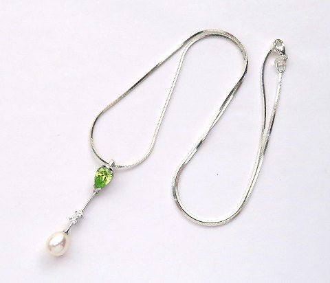 Collier af sterlingsølv med aflangt vedhæng, prydet med facetsleben peridot og to klare sten samt dråbeformet 7½ mm. perle. Kæde L. 50 cm., samlet vægt ca. 6 gr.