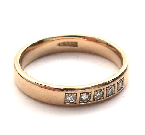 Ring af 14 kt guld, prydet med 5 brillantslebne diamanter på tilsammen ca. 0,15 ct. Ring Str. 58., samlet vægt ca. 5 gr.