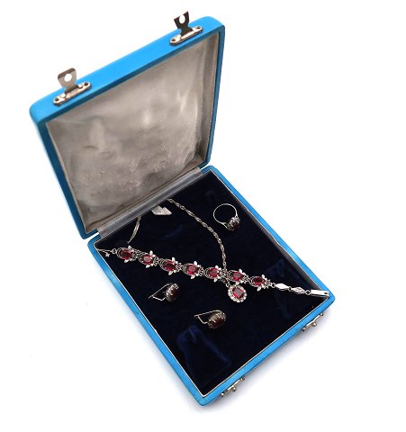Smykkesæt af sterling sølv bestående af snoet halskæde med vedhæng, L 54 cm., Par ørestikker, armlænke, L. 17 cm. samt ring, Str. 54. Alle dele prydet med facetsleben centersten, omkranset af facetterede klare sten.
