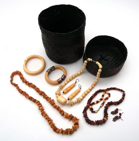 Samling bestående af tre forakellige ravkæder, L. 60, 40 og 20 cm. samt afrikansk/asiatiske stamme smykker i form af halskæde, par ørelokker og to armringe. Stammesmykkerne er gamle og kan godt være lavet af elfenben.