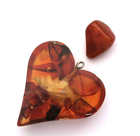 Vedhæng af poleret rav med knækket øsken samt hjertevedhæng af ravlignende kunststof med indstøbt konkylie. Henholdsvis 20 x 15 mm. og L. 45 mm.