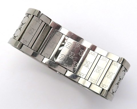 Gucci damearmbåndsur i urkasse og med lænke af logo prydet stål. Bronzefarvet skive bag mineralglas uden stregindikation. Quartzværk. Urkasse i gyroophæng, diameter 12 mm.
