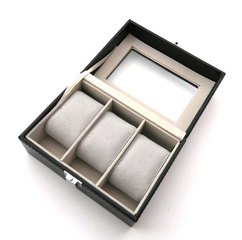 Showcase og opbevaringsboks, betrukket med sort læderimitat. Glaslåg. Indvendig med fag og puder til tre armbåndsure. 16 x 11 x 8 cm.