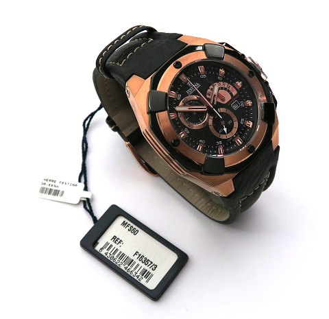 Fabriksnyt Festina Retrograde chronograph herrearmbåndsur, ref nr. F16357/3 i urkasse af guldtonet stål. Sort skive bag safirglas med stregindikation, dag/dato visning, central og separat sekundviser samt chronograph funktion. Quartzværk. Urkasse diameter 47 mm. Læderrem med Festina metalspænde.