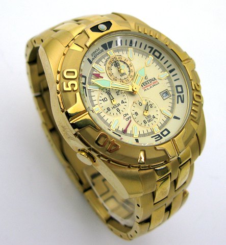Festina chronograph herrearmbåndsur, ref. nr. 16119/4 i urkasse og med lænke af guldtonet stål. Champagne farvet skive med separat sekundviser, stregindikation, datovisning i #4 positionen og chronograph samt alarmfunktioner. Quartsværk, urkasse diameter 43 mm.