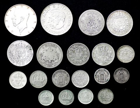 Sverige. 10, 25, 50 øre sølv samt 2 kr. og 1 kr. sølv 1875 - 1950. (19)