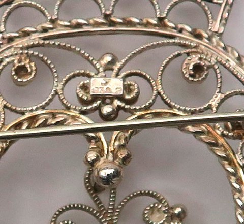 Antik norsk filigran broche af delvist forgyldt sølv i form af kronet hjerte med tre paillet vedhæng. L.10 cm, vægt ca. 21,5 gr. 20 årh.