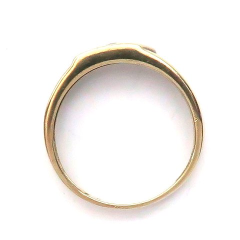 Herrering af 8 kt. guld, stiliseret cross-over front prydet med klar sten i facetslib. Ring str. 66, vægt ca. 3,5 gr.