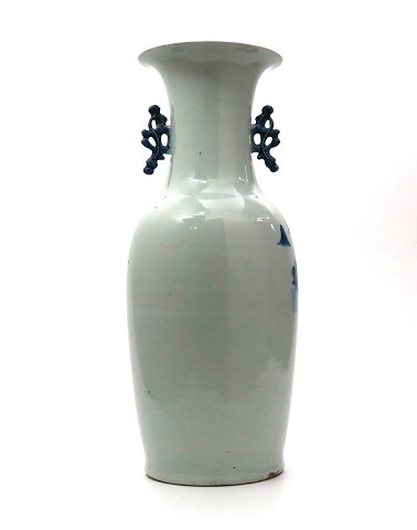 Tung Ching vase med balusterformet korpus og to ornamenthanke, blå bemalet med landskab og arkitektur. H. 58,5 cm.