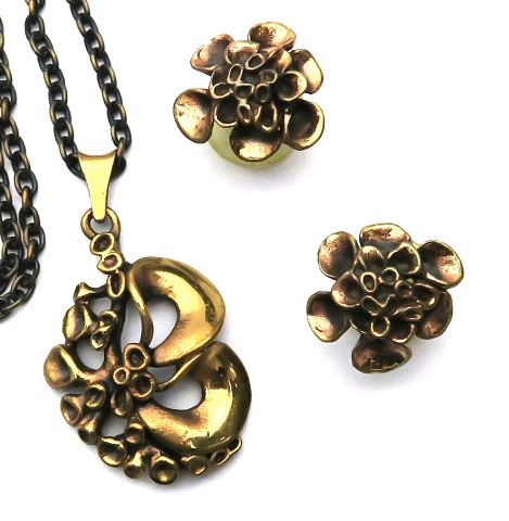 Finsk smykkesæt af patineret bronze i form af halskæde med vedhæng og par ørestikker. Kæde L. 62 cm., vedhæng L. 42 mm. Made in Finland.