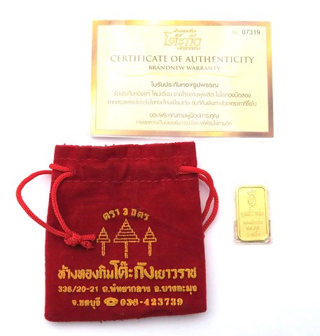 7,6 gr. guldbarre (.965) med certifikat af Kimtoekang guldsmed, Thailand. Certifikat og opbevaringspose medfølger.