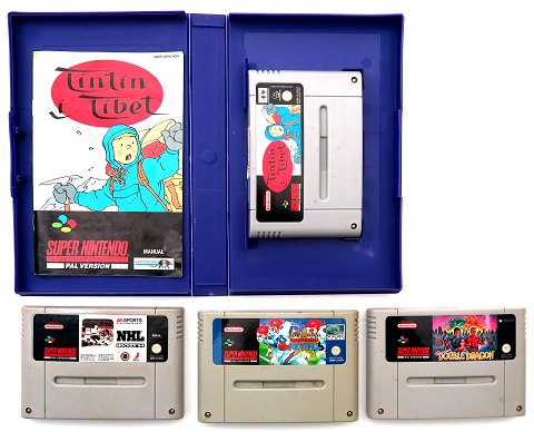 Nintendo SNES spil *Tintin I Tibet, Double Dragon, NHL Hockey '94, All american foodball (4)