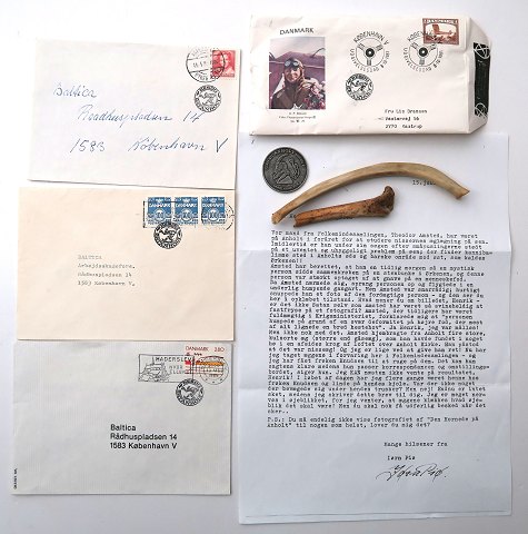 Satanmønt med portræt af Lucifer *13. maj 1973 Anholt - Lucifers Ø* og *Himmel og Helvede*, revers *Alice Mandragora - budbringeren mellem Gud og Djævelen 1973* Diameter 35 mm., vægt 15,5 gr. Diverse korrespondance, frankerede og *Anholt* stemplede kuverter fra bevægelsens medlemmer, samt konvolut indeholdende dyreknogler medfølger.