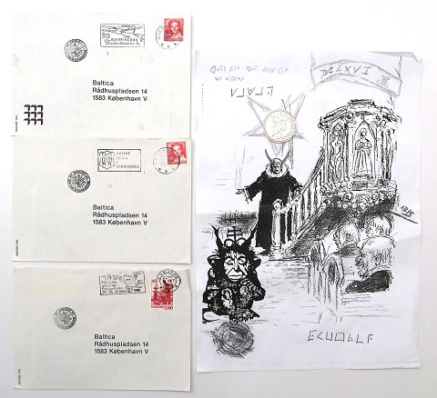 Diverse frankerede og *Anholt* stemplede kuverter fra bevægelsens medlemmer, samt satanistisk tegning med påtegnelser medfølger.