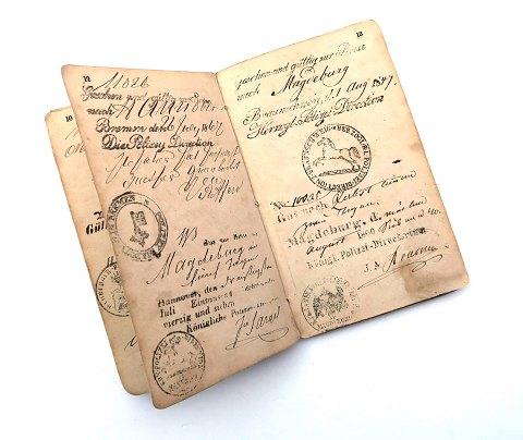 Vandrebog, tidl. tilhørende en glarmestersvend på valsen i H.C. Andersens tid i midten af 1800'tallet, med talrige stempler og påtegninger fra Tyskland.