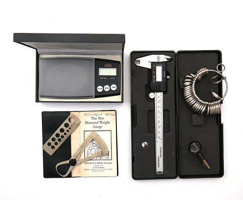 Lot bestående af digital skydelære 0 . 150 mm., ædelsten pincet med lup, elektronisk finvægt, diamantmåler og caratberegnings kalkulator samt bundt ringmålere.