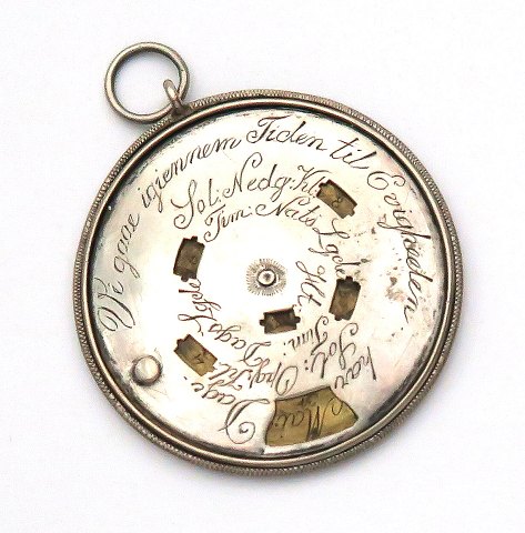 Evighedskalender i skiveform med visning af ugedag, dato, sol op- og nedgang ved timeindstilling m.v. Gravure *Vedervarende Calender - Vi gaae igennem tiden til evigheden* Diameter 50 mm.