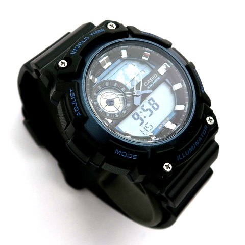 Casio World Time herrearmbåndsur, ref. nr. 5472 i urkasse af kunststof og stål. Analog og digital tidtagning med separat sekundviser, stregindikation, belysning , world time m.v. samt chronograph funktion. Quartzværk. Urkasse diameter 45 mm. Gummirem med metalspænde.