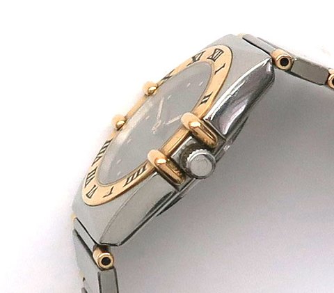 Omega Constellation damearmbåndsur, ref nr. 795.1243 i urkasse og med foldelænke af guld/stål. Lynette med arabertal, sort skive med punktindikation bag plexiglas. Quartzværk caliber 1456. Urkasse diameter 22,5 mm.