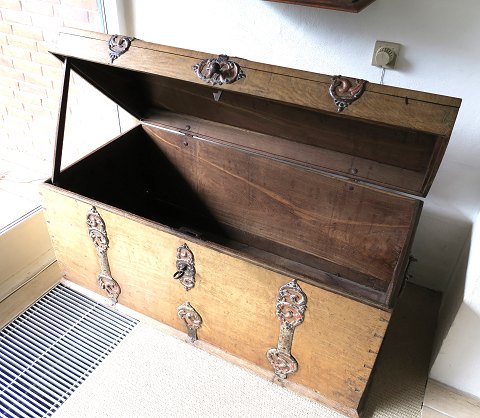 Antik kiste af egetræ med lås og jernbeslag. L. ca. 160 cm.