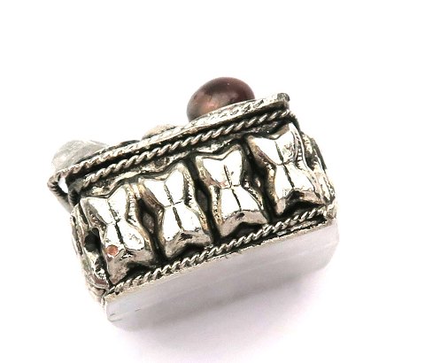 Orientalsk pilleæske, prydet med cabochonslebne sten. 25 x 25 x 15 mm., samlet vægt ca. 8 gr.