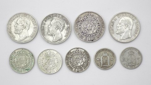 Lot bestående af 2 kr. 1876, 1904, 1907 og 1910 sølv, 1 kr. 1915, 1927 og 1928 sølv samt 50 Öre 1880 og 1899 sølv.
