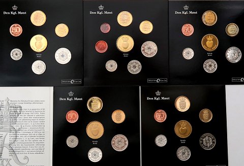 Møntsættene indeholder samtlige mønter i Danmarks møntserie i de pågældende år. Desuden indeholder de den Kgl. Mønts medalje for det pågældende år, som er kopier af tidligere medaljer: 2008 *Slaget ved Kronborg*, 2009 *Neptun*, 2010 *Indvielsen af flådens første tørdok 1739*, 2011 *Kongeligt monogram for Kong Frederik d.9.*, 2012 *Kongeligt monogram for Kong Christian d. X.*. I originale ubrudte blisterkort fra Den Kgl. Mønt.