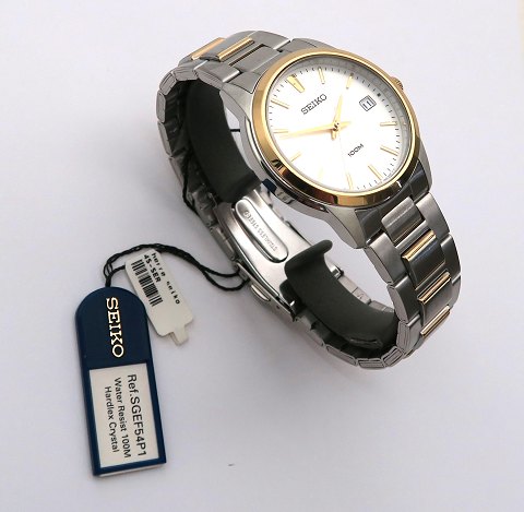 Seiko, klassisk herrearmbåndsur, ref. nr. SGEF54P1 i urkasse og med lænke af stål med guldtonet krans og krone. Lys metallic struktureret skive