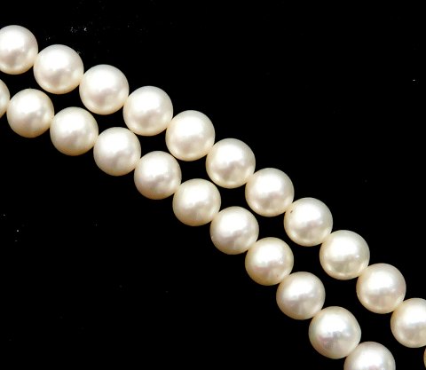 Perlekæde med runde kvalitets 7 mm. ferskvandsperler og karabinlås af sterling sølv. L. 43 cm.