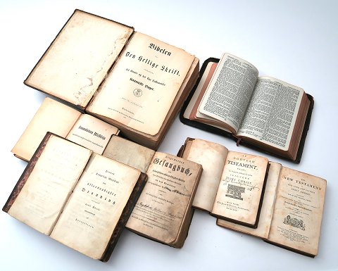 Samling antik Kristen litteratur og sangbøger på dansk, finsk, engelsk, tysk og amerikansk sprog bestående af Dansk bibel 1886, amerikansk Holy Bible u/å, Dansk andagtsbog 1820, Finsk salmebog 1900, Engelsk The New Testament 1819, Fransk Noveau Testament 1864 og Schleswig Holstein kirkesangbog 1828.