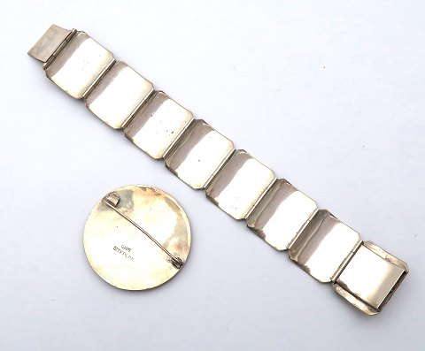 Siamesisk smykkesæt af sterling sølv bestående af broche, diameter 45 mm. samt armlænke, L. 18 cm. Begge dekoreret med thailandske tempelfigurer. Samlet vægt ca. 65 gr.