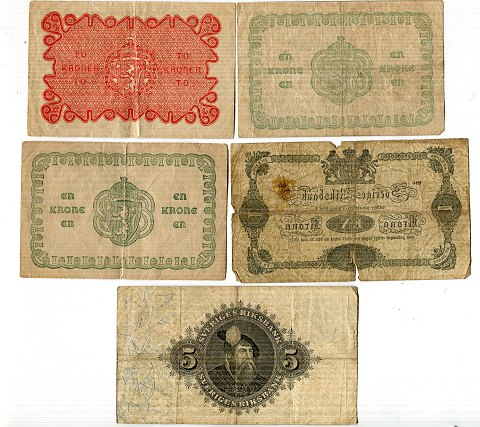 Norge 1 kr. 2x 1917 og 1918, Sverige 1 kr. 1914 og 5 kr. 1917.