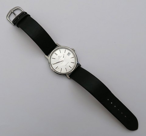 Omega Genève 1974 klassisk Vintage herrearmbåndsur, ref. nr. 136.0099 i urkasse af stål. Metallic grå skive med stregindikation, central sekundviser og datovisning i #3 position. Manuelt mekanisk optræksværk kaliber 1030. Urkasse diameter 35 mm. Fornyet læderrem med metalspænde.