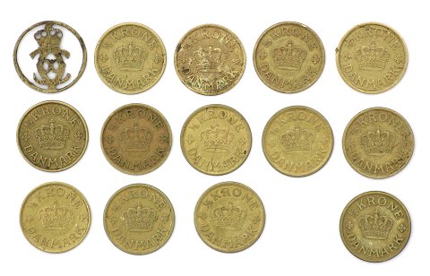 7x ½ kr. 1924, 5x1925 og 1940. Desuden Christian X monogram savet ud af en ½ kr.