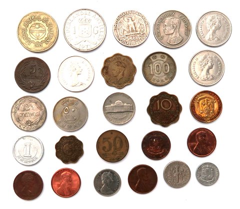 Filippinerne 5 stk., Japan 2 stk., Ceylon 2 stk. Thailand, Kuwait, Hollandske Antiller, Venezuela, Brasilien hver 1 stk., USA 6 stk. Canada 5 stk. Uruguay 1 stk., i alt ca. 115 gr.