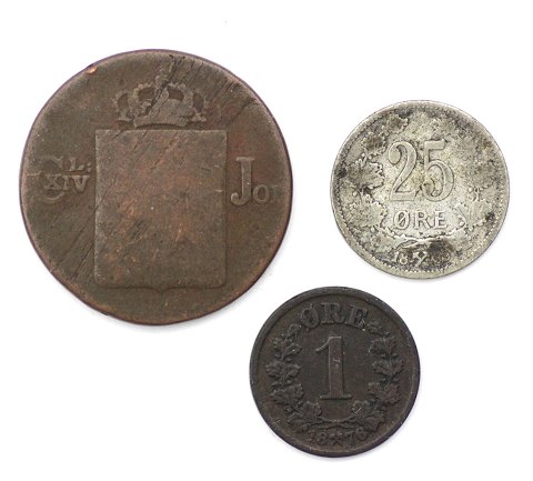 Lot bestående af 1 Skilling Species kobber 1820, 1 øre bronze 1876 og 25 øre sølv 1899.