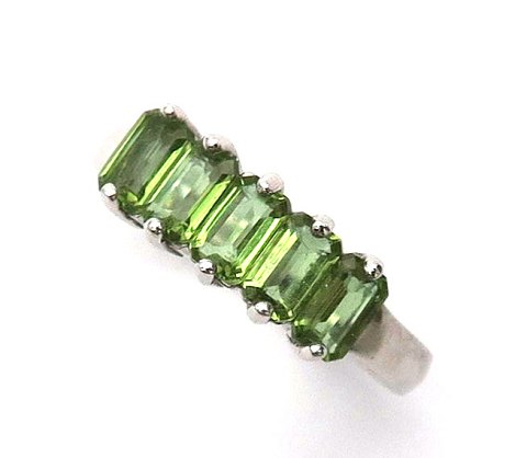 Ring af sterling sølv, prydet med baquettslebne sten (formodentlig varmebehandlede ametyster) Ring Str. 53½.