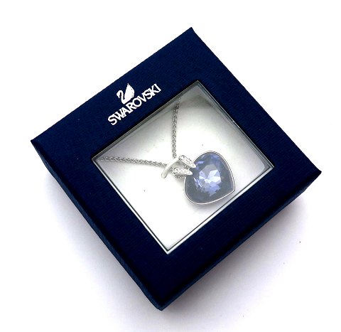 Svarovski halssmykke af rhodineret sølv med hjertevedhæng, prydet med stor tanzanitfarvet zirkonia. Kæde L. 44 cm.