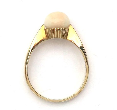 Ring af 14. kt guld, prydet med hvid 8,2 mm. opal. Ring Str. 57½, samlet vægt ca. 4 gr.