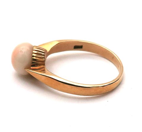 Ring af 14. kt guld, prydet med hvid 8,2 mm. opal. Ring Str. 57½, samlet vægt ca. 4 gr.