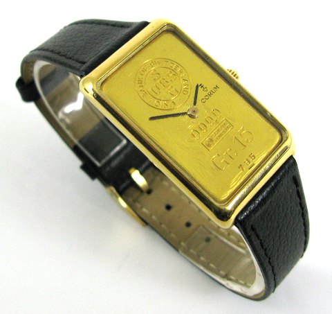 Corum herreur i 18k guld med sort læderem, urværket er bygget ind i en finguld guldbarre på 15 gr., dia. 24 x 41 mm. manuelt optræk. Krone med diamant Samlet vægt 47,3 g